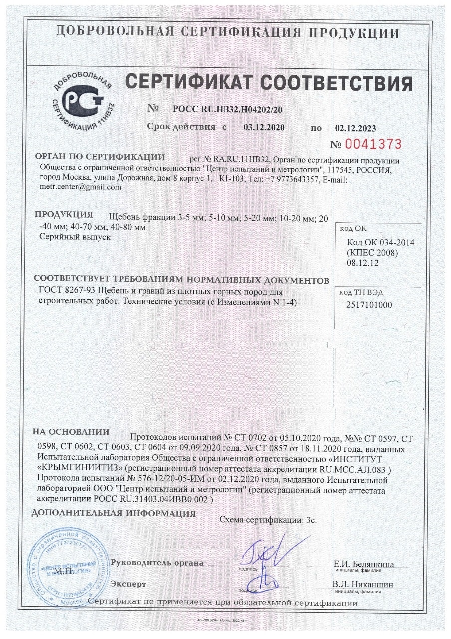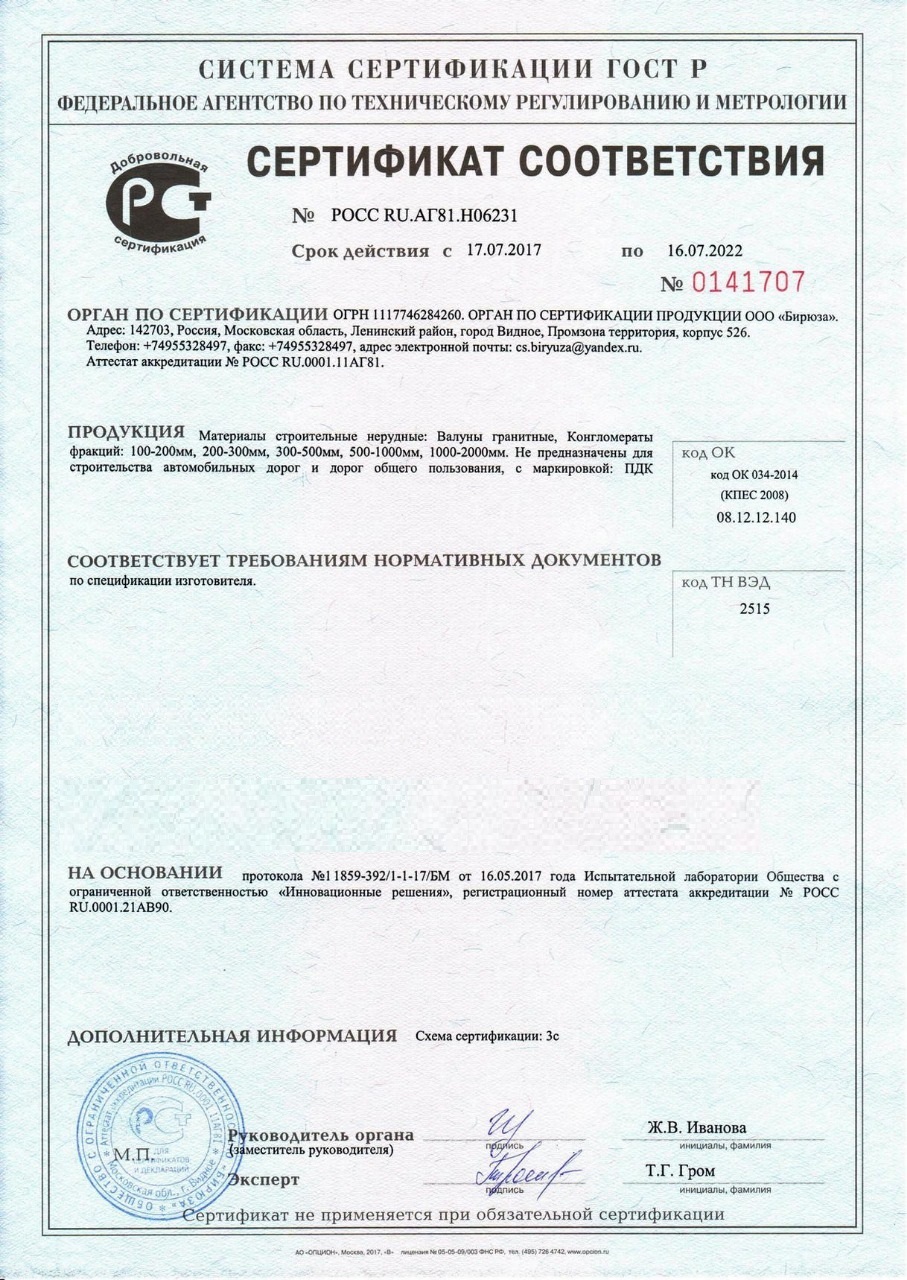Сертификат соответствия – документ, подтверждающий соответствие продукции требованиям качества и безопасности, установленными для нее действующими стандартами и правилами. Наш камень, который Вы сможете заказать с доставкой в Коломне , обладает всеми необходимыми документами для реализации и при необходимости могут быть предоставлены все необходимые подтверждающие документы при поставке.
