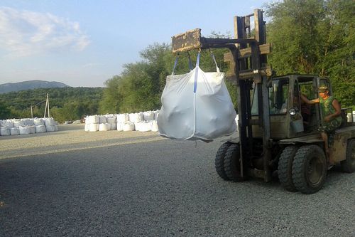 В основном камень транспортируется в биг-бегах это такие большие мешки вместимостью 1м3. Именно в такие мешки мы и упаковываем гальку, валунчики, щебень. Исключением являются большие валуны, глыбы или песчаные плиты - их укладываем в прицеп и закрепляем стропами.