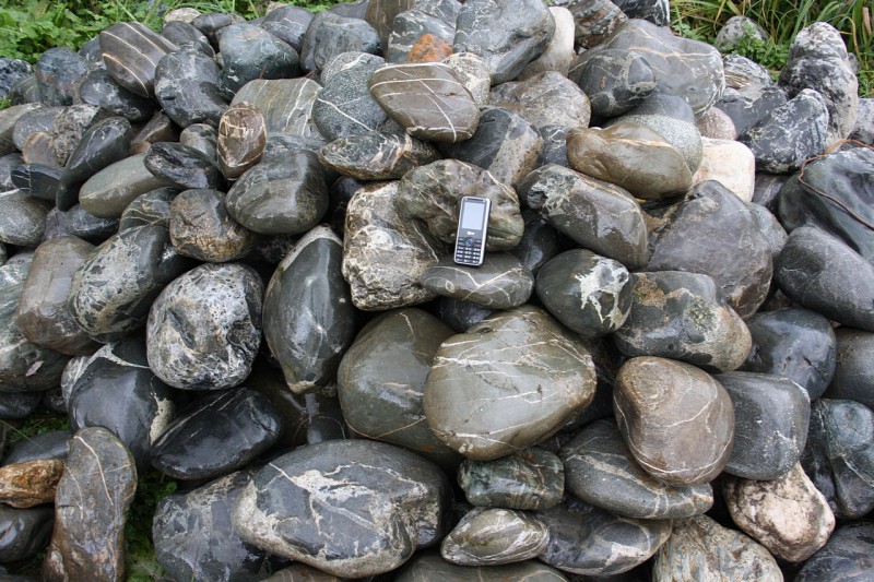 • Kamenclub.ru: Валунчик Паутинник фр.100-300 мм  купить в Коломне крупный природный камень галечник темно-серый с прожилками белый черный речной валунчик 5000 руб/т   фото КАМЕНЬ КЛУБ